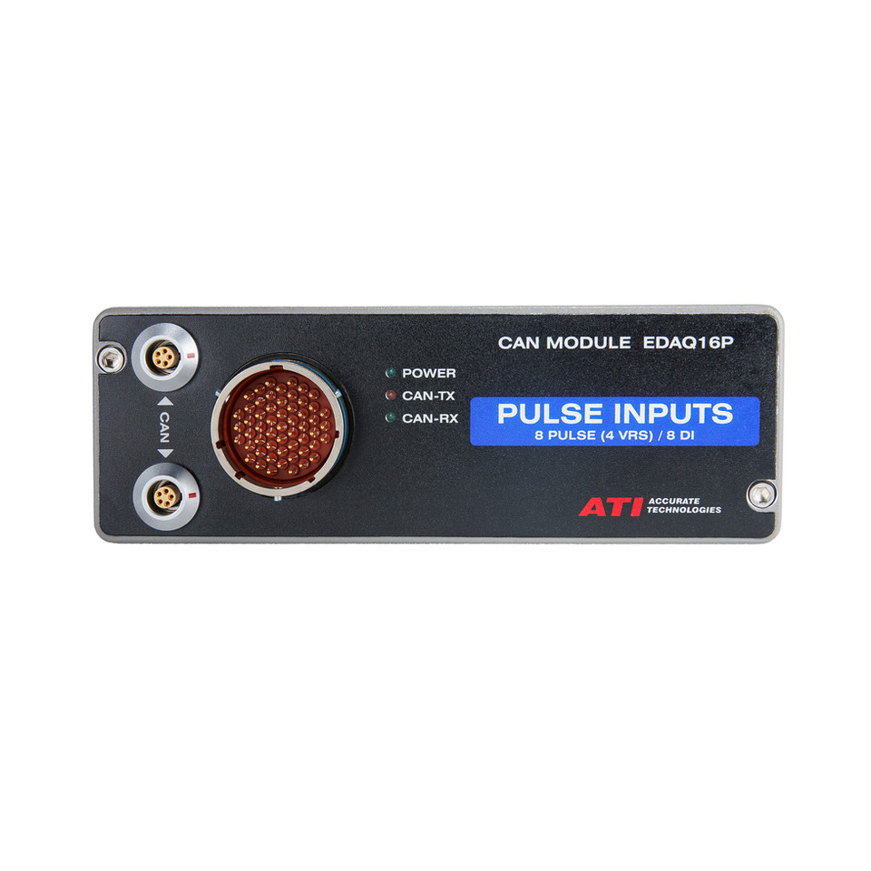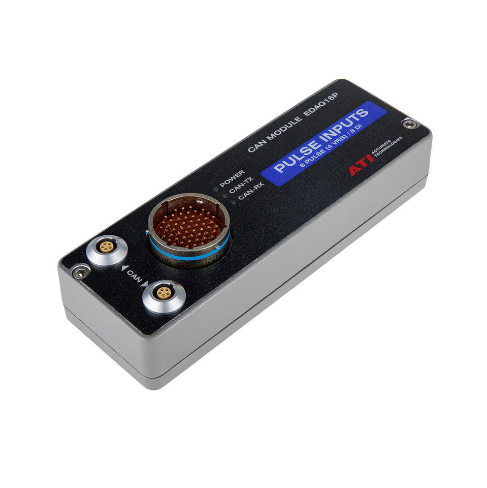 The EDAQ16P Pulse Inputs Data Acquisition Module measures frequency associated with digital signals, such as wheel speeds, RPM, solenoids, or switches. These modules communicate to VISION Calibration and Data Acquisition software through the VISION Network Hub using high-quality interconnects.